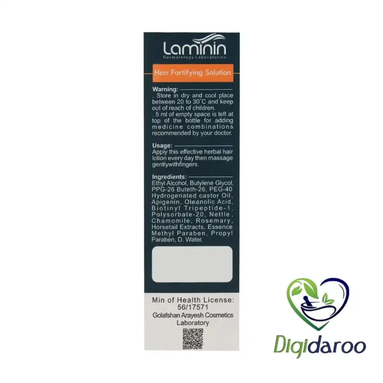 محلول تقویت مو لامینین حاوی مواد موثره طبیعی که از از ریزش مو جلوگیری نموده و به رویش مجدد مو کمک می نماید. همچنین به بازسازی و ترمیم ساقه های آسیب دیده و ریشه مو می پردازد.