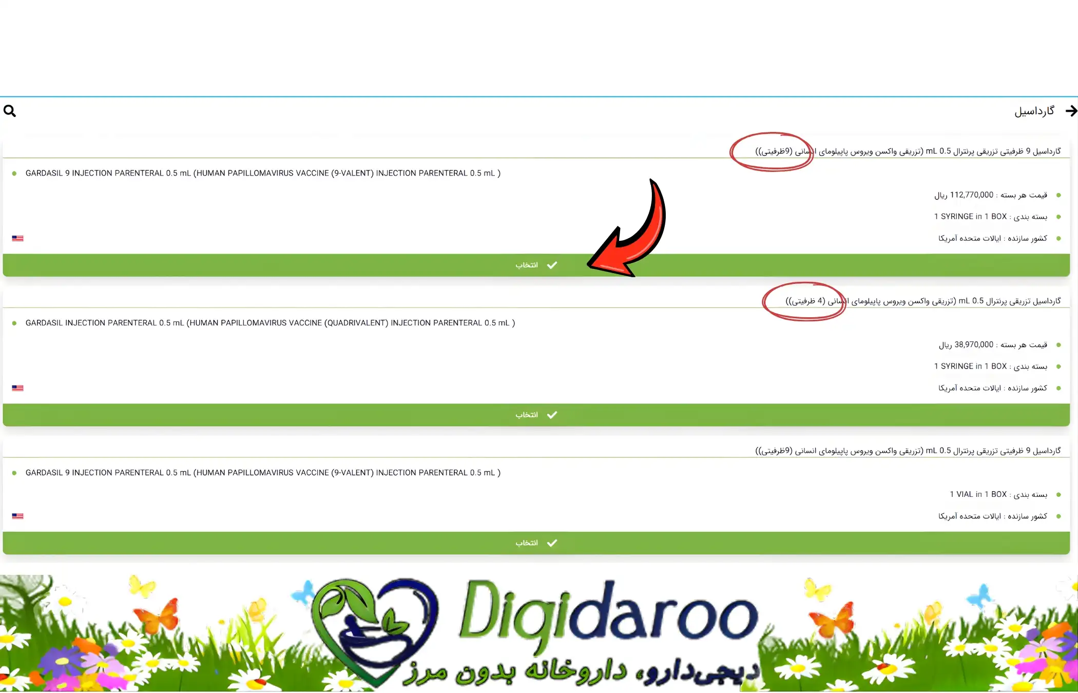 در اینجا ما واکسن گارداسیل را جستجو کرده‌ایم که صفحه ایی برای ما باز شد تا انتخاب کنیم گارداسیل 9 ظرفیتی را میخواهیم یا 4 ظرفیتی.